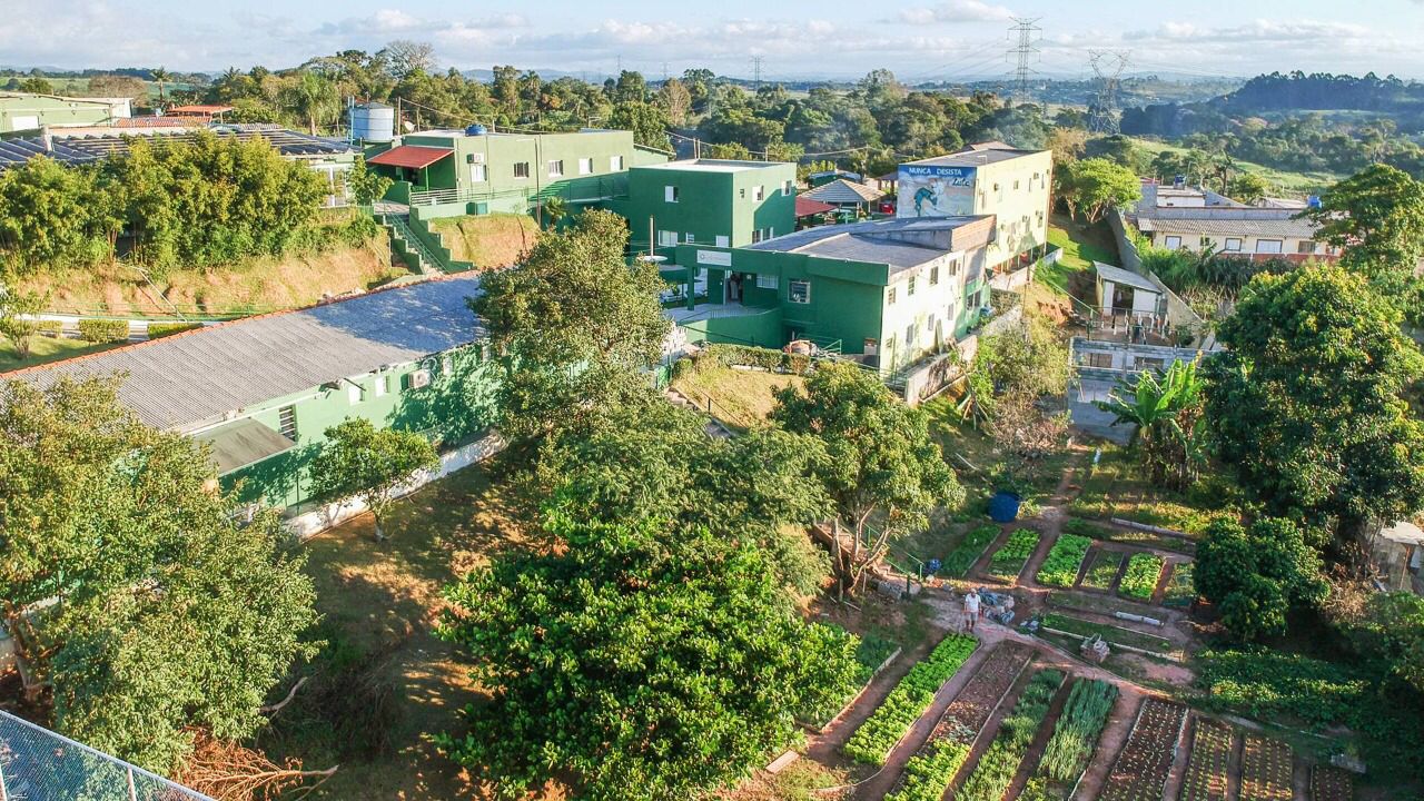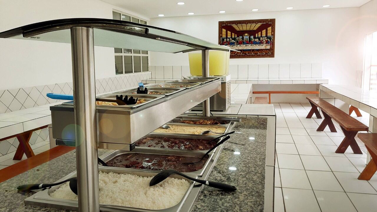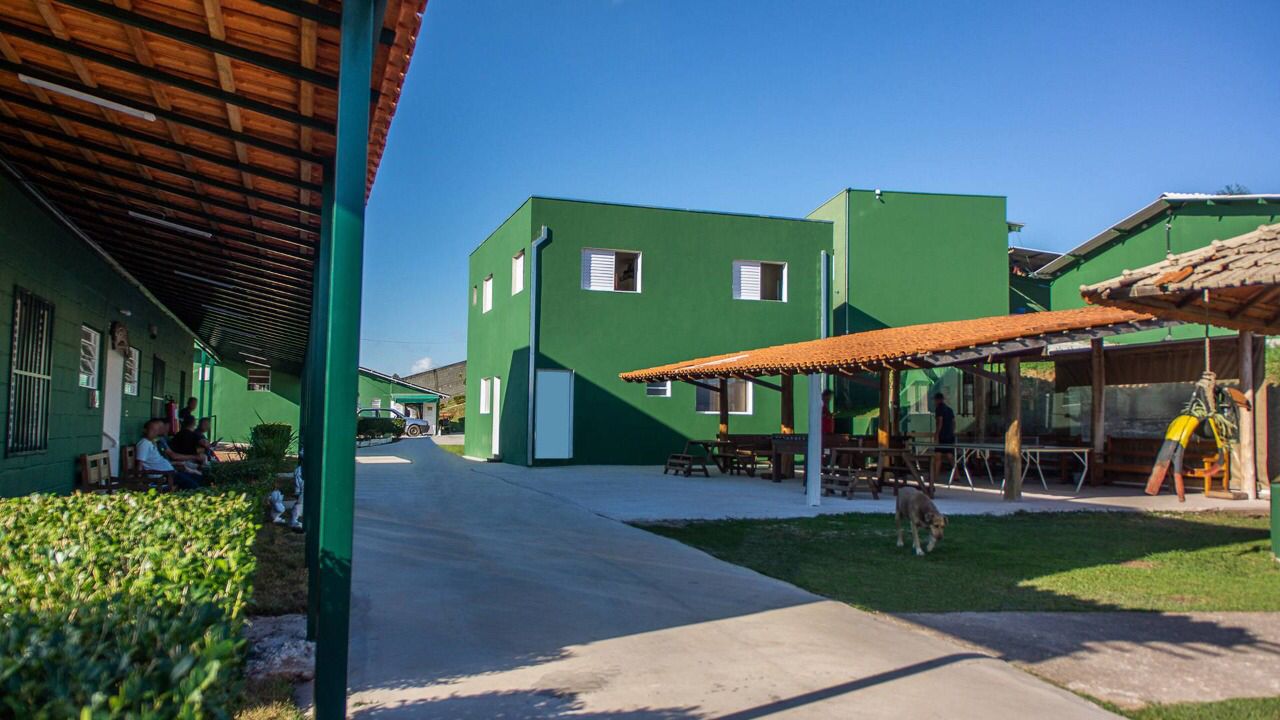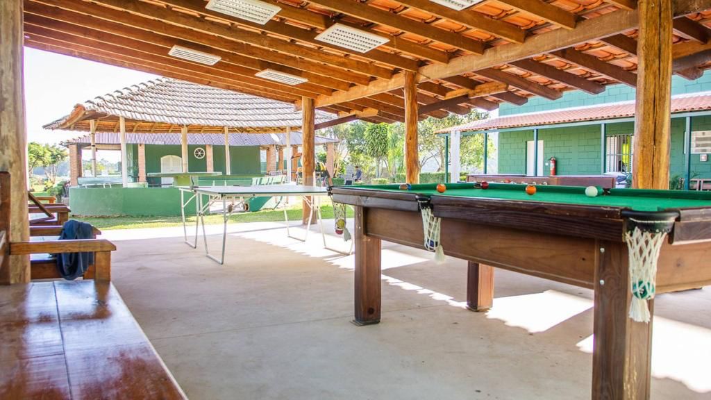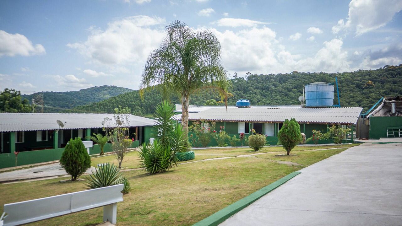 Ambientes equipados com piscina, academia, campo e quadra para esportes, refeitório, além de uma área ampla.