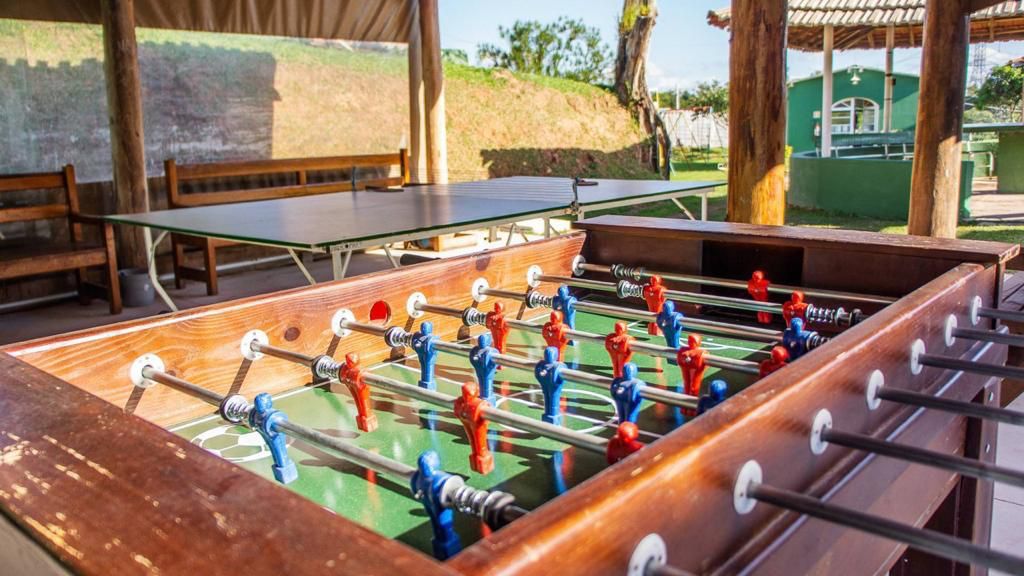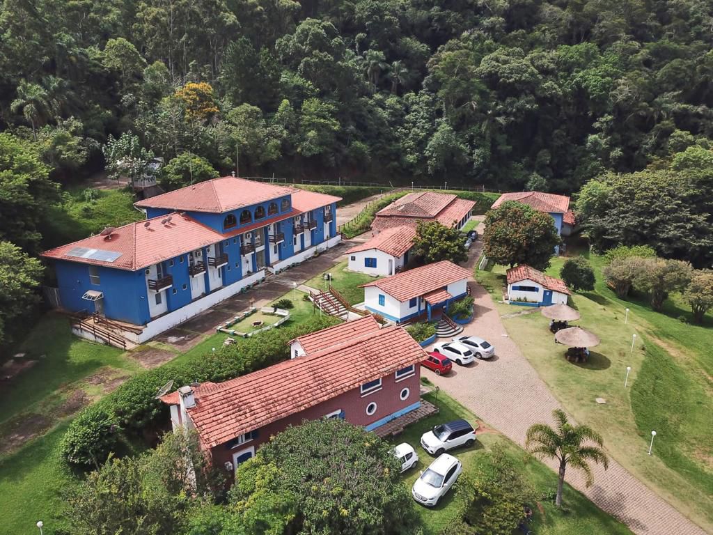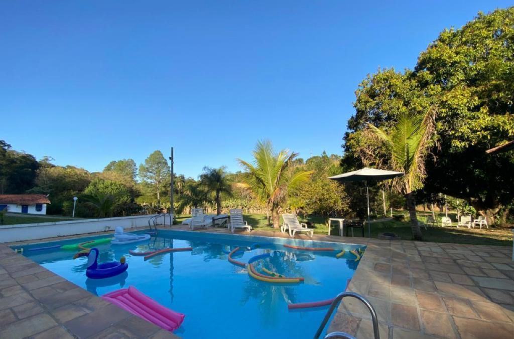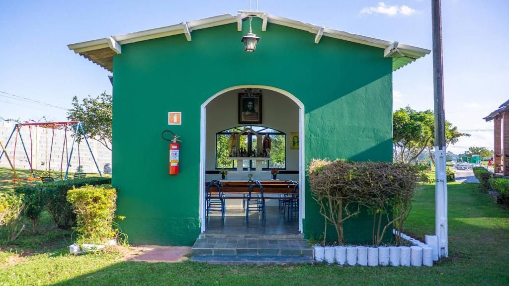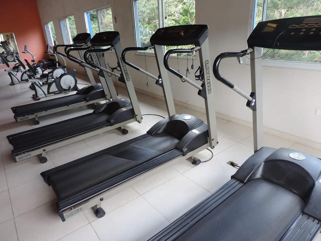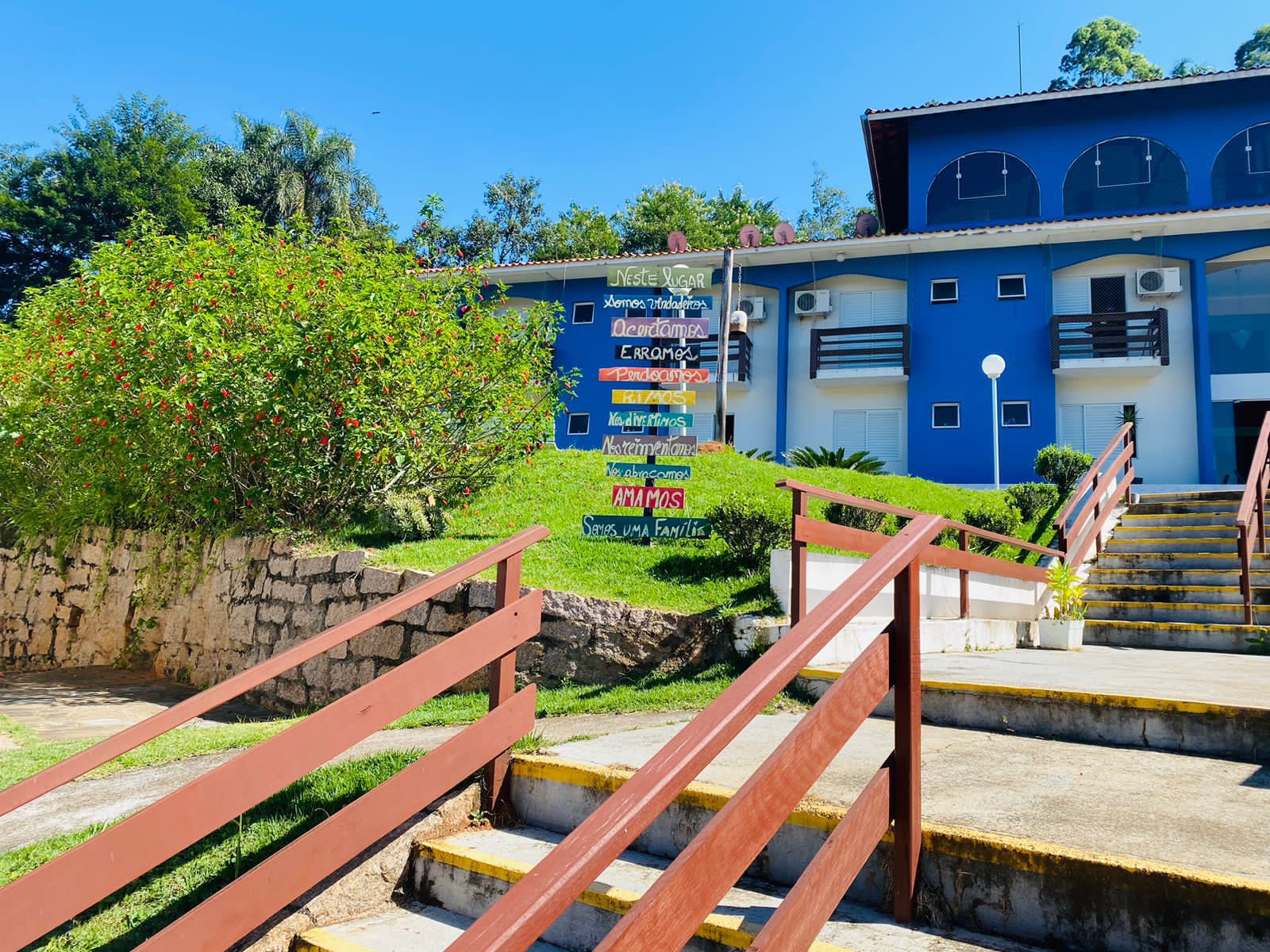 Ambientes equipados com piscina, academia, campo e quadra para esportes, refeitório, além de uma área ampla.