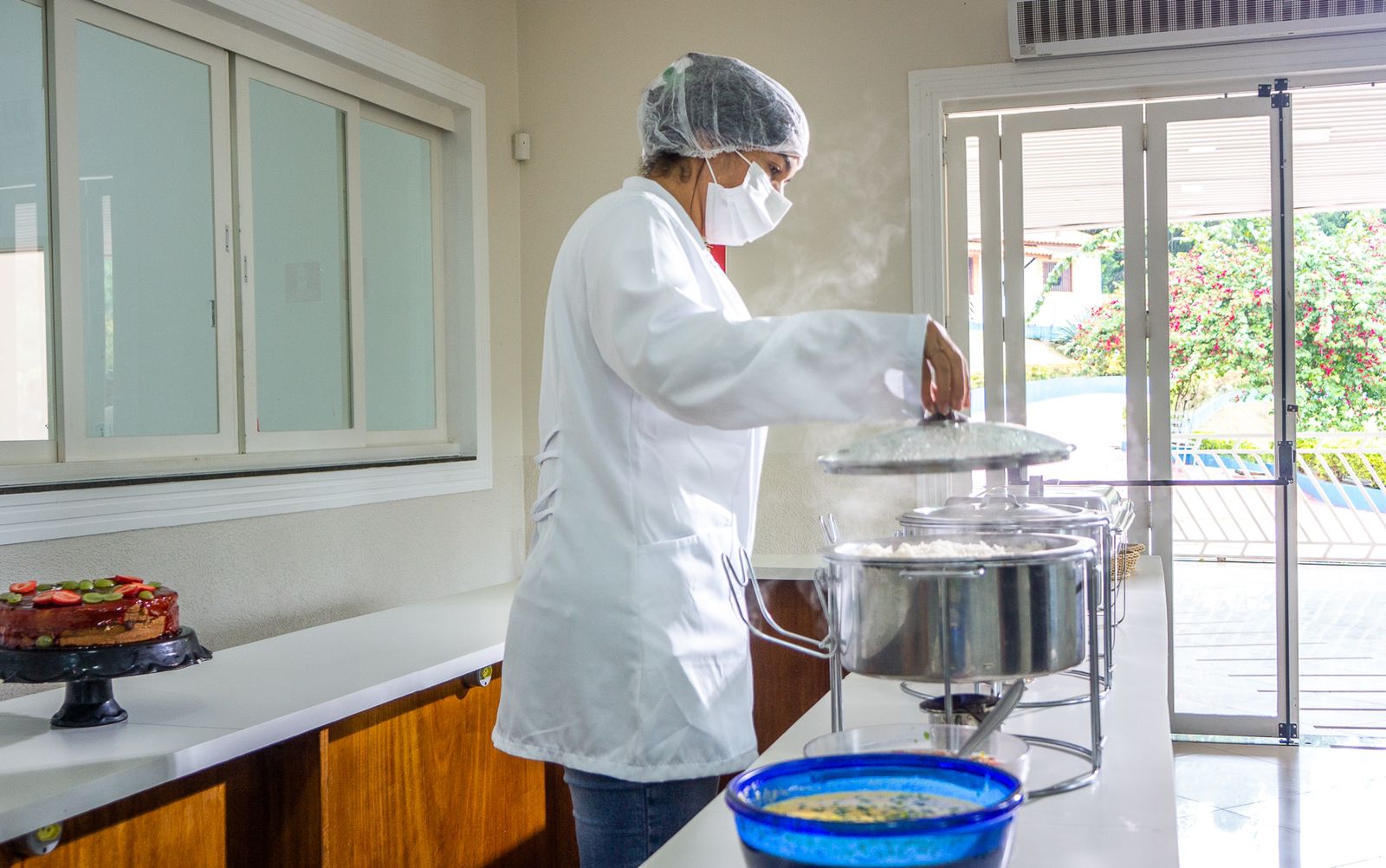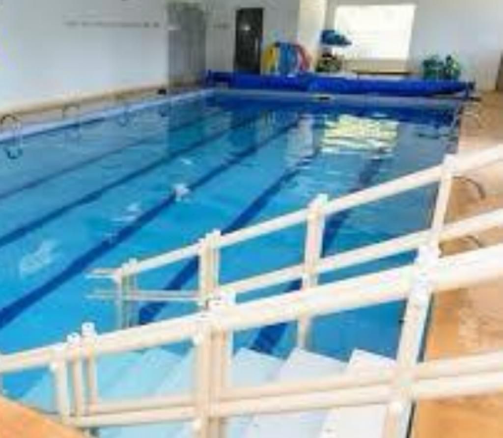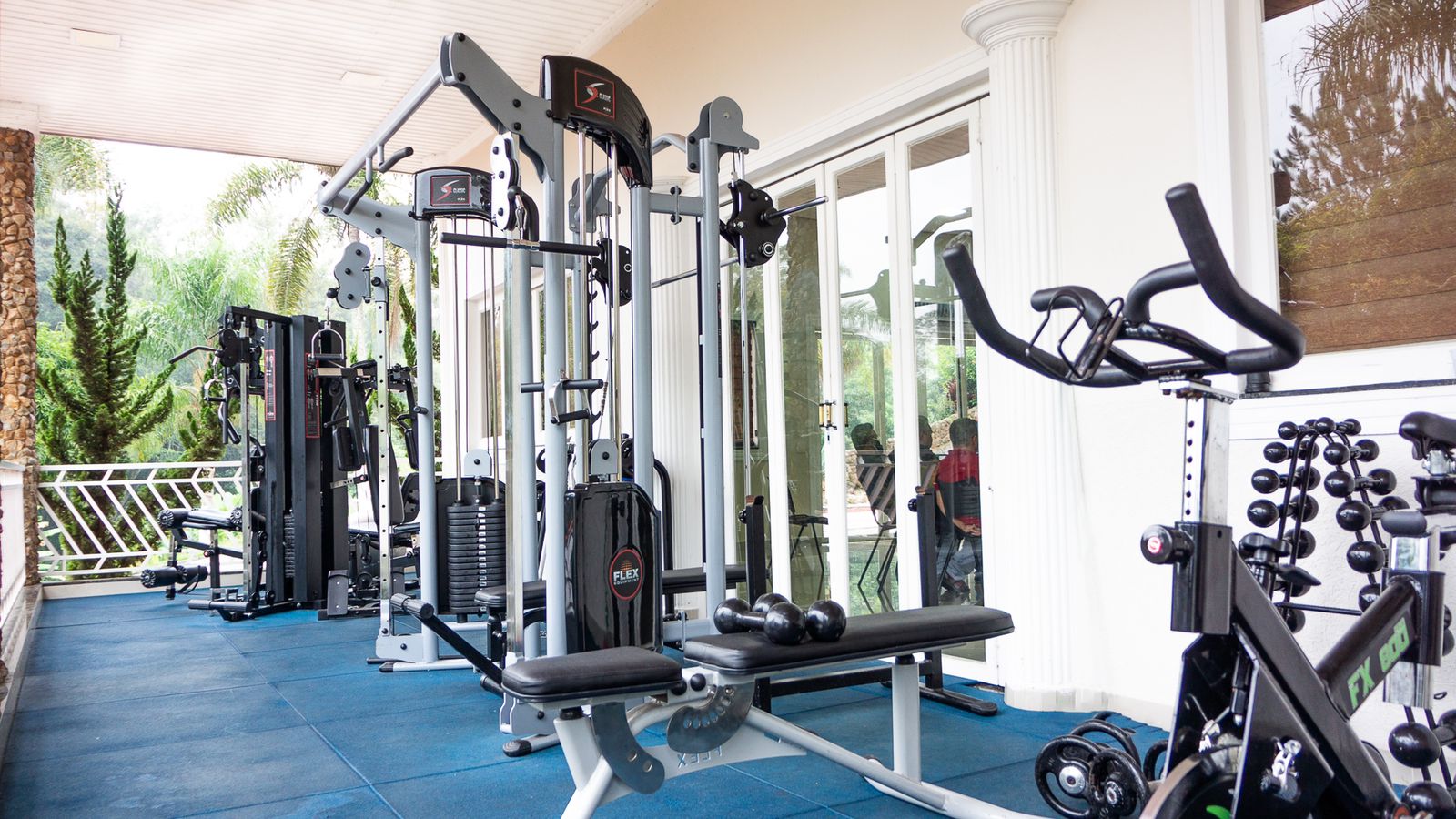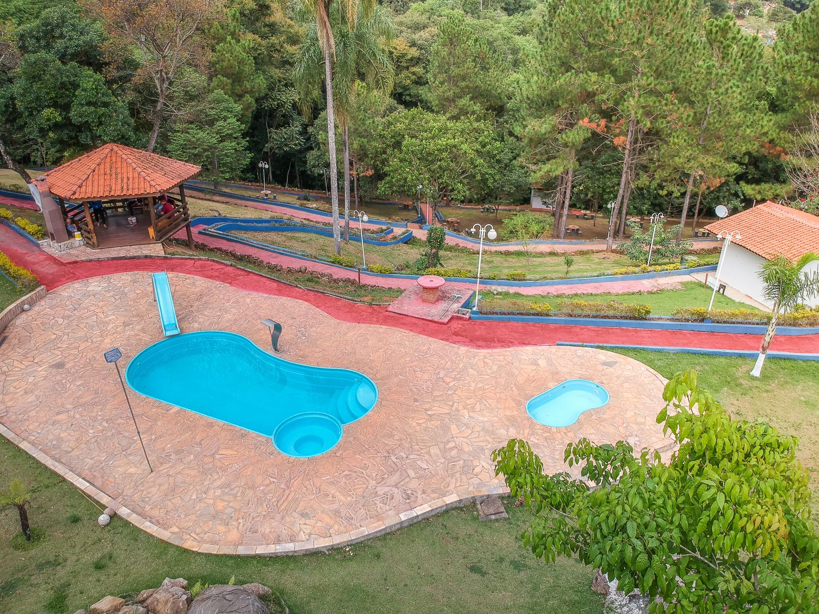 Ambientes equipados com piscina, academia, campo e quadra para esportes, refeitório, além de uma área ampla.